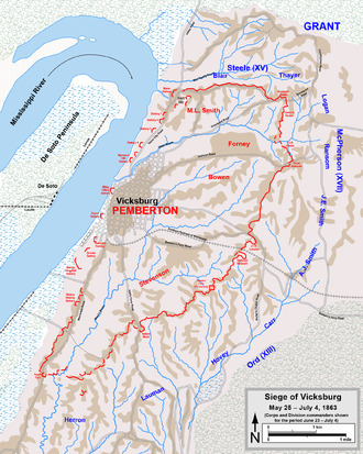 - ^ Vicksburg Campaign; History.com online website; text: "...The Siege of Vicksburg (May 18, 1863 – July 4, 1863) was a decisive Union victory during the American Civil War (1861–65) ..."; accessed June 2020