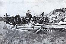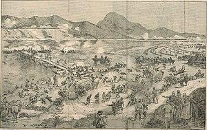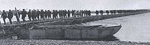 Japanese engineers determined that ten bridges 1,630 yards (1490.5m) would be required to span the river. A third of these were steel prefabricated pontoons which weighed 100 pounds each.[3] The remainder were made from local resources. In full view of Russian positions, the Japanese began constructing a causeway across the Yalu River, which was immediately targeted by two Russian batteries. With the Russians so engaged, the Japanese prepared nine other bridges that could quickly be moved into position for a rapid assault across the river at other locations.