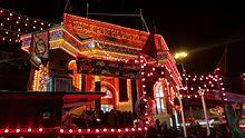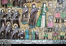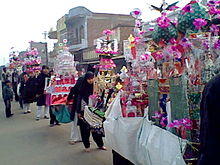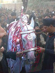 During the month of Muharram, elaborate public processions are performed in commemoration of the Battle of Karbala. In contrast to pilgrimage to Husayn's tomb and simple lamenting, these processions do not date back to the time of the battle, but arose during tenth century. Their earliest recorded instance was in Baghdad in 963 during the reign of the first Buyid ruler Mu'izz al-Dawla.[118] The processions start from a husayniyya and the participants parade barefoot through the streets, wailing and beating their chests and heads before returning to the husayniyya for a majlis.[119][120] Sometimes, chains and knives are used to inflict wounds and physical pain.[121] In South Asia, an ornately tacked horse called zuljenah, representing Husayn's battle horse, is also led riderless through the streets.[122] In Iran, the battle scenes of Karbala are performed on stage in front of an audience in a ritual called taziya (passion play), also known as shabih.[123][124] In India however, taziya refers to the coffins and replicas of Husayn's tomb carried in processions.[123][125]