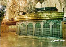 Shi'a Muslims consider pilgrimages to Husayn's tomb to be a source of divine blessings and rewards.[111] According to Shi'a tradition the first such visit was performed by Husayn's son Ali Zayn al-Abidin and the surviving family members during their return from Syria to Medina. The first historically recorded visit is Sulayman ibn Surad and the Penitents going to Husayn's grave before their departure to Syria. They are reported to have lamented and beaten their chests and to have spent a night by the tomb.[112] Thereafter this tradition was limited to the Shi'a imams for several decades, before gaining momentum under the sixth Shi'a imam Jafar Sadiq and his followers. Buyids and Safavids also encouraged this practice.[111] Special visits are paid on 10 Muharram (Ashura Pilgrimage) and 40 days after the anniversary of Husayn's (Arba'een Pilgrimage).[113] The soil of Karbala is considered to have miraculous healing effects.[111]