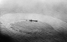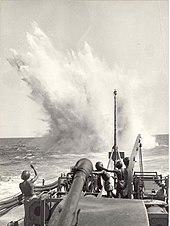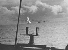 One of the more important developments was ship-borne direction-finding radio equipment, known as HF/DF (high-frequency direction-finding, or Huff-Duff), which started to be fitted to escorts from February 1942. These sets were common items of equipment by the spring of 1943.[45] HF/DF let an operator determine the direction of a radio signal, regardless of whether the content could be read. Since the wolf pack relied on U-boats reporting convoy positions by radio, there was a steady stream of messages to intercept. An escort could then run in the direction of the signal and attack the U-boat, or at least force it to submerge (causing it to lose contact), which might prevent an attack on the convoy. When two ships fitted with HF/DF accompanied a convoy, a fix on the transmitter's position, not just direction, could be determined. However, the standard approach of anti-submarine warships was immediately to "run-down" the bearing of a detected signal, hoping to spot the U-boat on the surface and make an immediate attack. Range could be estimated by an experienced operator from the signal strength. Usually the target was found visually. If the submarine was slow to dive, the guns were used; otherwise an ASDIC (Sonar) search was started where the swirl of water of a crash-diving submarine was observed. In good visibility a U-boat might try and outrun an escort on the surface whilst out of gun range. Running down the bearing of a HF/DF signal was also used by escort carriers (particularly USS Bogue, operating south of the Azores), sending aircraft along the line of the bearing to force the submarine to submerge by strafing and then attack with depth charges or a FIDO homing torpedo.[45][46]