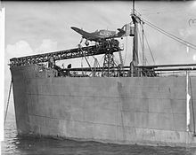 Aircraft ranges were constantly improving, but the Atlantic was far too large to be covered completely by land-based types. A stop-gap measure was instituted by fitting ramps to the front of some of the cargo ships known as Catapult Aircraft Merchantmen (CAM ships), equipped with a lone expendable Hurricane fighter aircraft. When a German bomber approached, the fighter was fired off the end of the ramp with a large rocket to shoot down or drive off the German aircraft, the pilot then ditching in the water and (hopefully) being picked up by one of the escort ships if land was too far away. Nine combat launches were made, resulting in the destruction of eight Axis aircraft for the loss of one Allied pilot.[44]