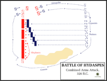Alexander commenced the battle by sending his Dahae horse archers to harass the Indian right-wing cavalry.[18] His armoured Companion Cavalry was sent to attack their outnumbered Indian counterparts on the left wing, with Alexander himself leading the charge as was his habit.[33] The rest of the Indian cavalry galloped to the aid of their hard-pressed kinsmen from the right wing, but Coenus's squadrons promptly followed their movement and attacked them from the rear. The Indian horsemen tried to form a double phalanx to face both attacks, but the necessary complicated manoeuvres brought even more confusion into their ranks, making it easier for the Macedonian cavalry to defeat them. The Indian cavalry were thus routed, and fled to the safety of their elephants.[36]