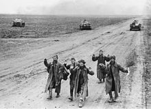 On 9 May, the German engineers finished breaching the anti-tank ditch and Manstein committed the 22nd Panzer Division, which swung north and trapped the 51st Army against the Sea of Azov on mid-day 10 May.[2] Confused Soviet counterattacks near Arma-Eli were blasted apart by German close air support and infantry-armor teams. The remaining combat-capable Soviet armor was eliminated by German airpower on 9 May and 25 Soviet aircraft were shot down by German Bf 109 fighters.[73] Richthofen's air units flew 1,700 sorties on 9 May and claimed 52 Soviet aircraft shot down for the loss of 2 of their own. A rainstorm gave the Soviets a brief respite on the evening of 9 May, but when it cleared the next morning, Fliegerkorps VIII destroyed the remaining isolated Soviet tanks, including 11 KV-1.[75] Soviet morale and organisation collapsed, and a stampede to the rear areas began. Once this happened, the eight divisions of the 51st Army surrendered on 11 May, releasing XXX Corps to pursue the fragments of retreating Soviet forces to Marfovka, barely eight miles from Kerch.[10] The motorized ad-hoc Groddeck brigade reached the Marfovka airfield in the afternoon and destroyed 35 fighters on the ground.[75] Fliegerkorps VIII's air supremacy peaked on 12 May, when it conducted 1,500 sorties without significant Soviet opposition and was free to bomb the fleeing Soviet columns, resistance nests and Kerch harbour.[76] Richthofen burned Kerch to the ground by dropping 1,780 bombs on it on 12 May.[2] That day, Richthofen was ordered to send the bulk of his combat units to support the German 6th Army at the Second Battle of Kharkov. The number of flown missions was reduced accordingly; from 1,500 to 2,000 sorties per day prior to the redeployment to between 300 and 800 to the end of the Kerch operation.[77] Richthofen described his bombing operations during Trappenjagd as 'concentrated air support, the likes of which has never existed'.[4]