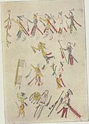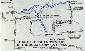 Among the Plains Tribes, the long-standing ceremonial tradition known as the Sun Dance was the most important religious event of the year. It is a time for prayer and personal sacrifice for the community, as well as making personal vows. Towards the end of spring in 1876, the Lakota and the Cheyenne held a Sun Dance that was also attended by a number of "Agency Indians" who had slipped away from their reservations.[26] During a Sun Dance around June 5, 1876, on Rosebud Creek in Montana, Sitting Bull, the spiritual leader of the Hunkpapa Lakota, reportedly had a vision of "soldiers falling into his camp like grasshoppers from the sky."[27] At the same time US military officials were conducting a summer campaign to force the Lakota and the Cheyenne back to their reservations, using infantry and cavalry in a so-called "three-pronged approach".