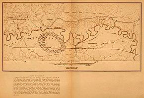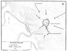 Atop the bluffs, known today as Reno Hill, Reno's depleted and shaken troops were joined by Captain Benteen's column (Companies D, H and K), arriving from the south. This force had been returning from a lateral scouting mission when it had been summoned by Custer's messenger, Italian bugler John Martin (Giovanni Martino) with the handwritten message "Benteen. Come on, Big Village, Be quick, Bring packs. P.S. Bring Packs."[44] Benteen's coincidental arrival on the bluffs was just in time to save Reno's men from possible annihilation. Their detachments were later reinforced by McDougall's Company B and the pack train. The 14 officers and 340 troopers on the bluffs organized an all-around defense and dug rifle pits using whatever implements they had among them, including knives. This practice had become standard during the last year of the American Civil War, with both Union and Confederate troops utilizing knives, eating utensils, mess plates and pans to dig effective battlefield fortifications.[63]