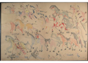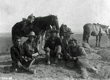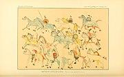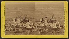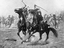 By almost all accounts, the Lakota annihilated Custer's force within an hour of engagement.[74][75][76] David Humphreys Miller, who between 1935 and 1955 interviewed the last Lakota survivors of the battle, wrote that the Custer fight lasted less than one-half hour.[77] Other native accounts said the fighting lasted only "as long as it takes a hungry man to eat a meal." The Lakota asserted that Crazy Horse personally led one of the large groups of warriors who overwhelmed the cavalrymen in a surprise charge from the northeast, causing a breakdown in the command structure and panic among the troops. Many of these men threw down their weapons while Cheyenne and Sioux warriors rode them down, "counting coup" with lances, coup sticks, and quirts. Some Native accounts recalled this segment of the fight as a "buffalo run."[78]