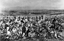 The Battle of the Little Bighorn, known to the Lakota and other Plains Indians as the Battle of the Greasy Grass[12] and also commonly referred to as Custer's Last Stand, was an armed engagement between combined forces of the Lakota, Northern Cheyenne, and Arapaho tribes and the 7th Cavalry Regiment of the United States Army. The battle, which resulted in the defeat of U.S. forces, was the most significant action of the Great Sioux War of 1876. It took place on June 25–26, 1876, along the Little Bighorn River in the Crow Indian Reservation in southeastern Montana Territory.[13]