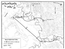 Reno advanced rapidly across the open field towards the northwest, his movements masked by the thick bramble of trees that ran along the southern banks of the Little Bighorn River. The same trees on his front right shielded his movements across the wide field over which his men rapidly rode, first with two approximately forty-man companies abreast and eventually with all three charging abreast. The trees also obscured Reno's view of the Native American village until his force had passed that bend on his right front and was suddenly within arrow-shot of the village. The tepees in that area were occupied by the Hunkpapa Sioux. Neither Custer nor Reno had much idea of the length, depth and size of the encampment they were attacking, as the village was hidden by the trees. When Reno came into the open in front of the south end of the village, he sent his Arikara/Ree and Crow Indian scouts forward on his exposed left flank.[59] Realizing the full extent of the village's width, Reno quickly suspected what he would later call "a trap" and stopped a few hundred yards short of the encampment.