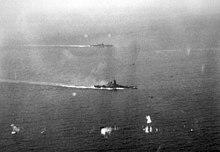 Sometime near 07:27, at a range of 9,000 yards (8.2 km), Hoel fired a half salvo of torpedoes and reversed course.[36] The results of this salvo were not observed, but several histories report that Haguro was forced to turn sharply away from the torpedo attack and dropped out of the lead to behind Tone,[39] an assertion that is contradicted by Haguro's detailed action report, which records turning to engaging an "enemy cruiser" (Hoel) at 10,300 yards (9.4 km), but not a torpedo attack.[40]