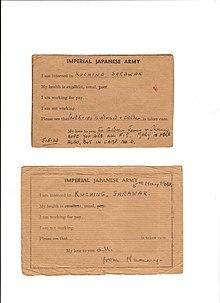 Pre-printed postcards to be sent home with stock phrases such as "I am well" and "We have plenty of food" were issued occasionally;[91] Agnes Keith records that these were issued three times a year but in May 1945 it was decided that a certain percentage of the camp had to include a propaganda sentence in addition to the 25 permitted words of free text. She wrote: