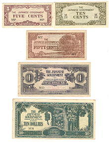 The work party men were paid in what the prisoners called "camp dollars", the printed paper currency introduced by the Japanese administration. This currency was known colloquially as "banana money" because of the banana trees pictured on the 10 dollar notes.[44] At one point the rate was 25 cents a day for officers and NCOs and 10 cents a day for other ranks.[45] As time went on, the working parties became smaller, as there was a lack of available men due to sickness and death.