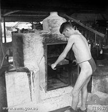 Rations were always meagre but decreased in both quantity and quality as the war progressed. The women and children drew the same rations as the men. The Japanese controlled all food supplies, releasing only what was needed for the day.[49] At the beginning, the rations comprised rice and local vegetables (such as kangkung), with every 10 days or so some pork (such as offal, or a head, or some poor-meat bearing part of the animal). The daily rice ration in late 1943 was 11 ounces (312 grams) a day;[50] by the end of the war the rice ration was about 4 ounces (113 grams) per man daily.[51] In September 1944, children were recorded as receiving 50 millilitres (1.8 imp fl oz; 1.7 US fl oz) of milk a day.[52]