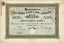 Bayer AG was founded as a dyestuffs factory in 1863 in Barmen (later part of Wuppertal), Germany, by Friedrich Bayer and his partner, Johann Friedrich Weskott, a master dyer.[10] Bayer was responsible for the commercial tasks. Fuchsine and aniline became the company's most important products.