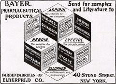 Heroin (diacetylmorphine), now illegal as an addictive drug, was introduced as a non-addictive substitute for morphine,[22] and trademarked and marketed by Bayer from 1898 to 1910 as a cough suppressant and over-the-counter treatment for other common ailments, including pneumonia and tuberculosis.[23] Bayer scientists were not the first to make heroin, but the company led the way in commercializing it.[24] Heroin was a Bayer trademark until after World War I.[25] Bayer's director of pharmacology did not want the drug to have "too complicated a name" so Bayer settled on heroisch, the German word for heroic.[26]