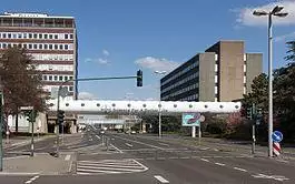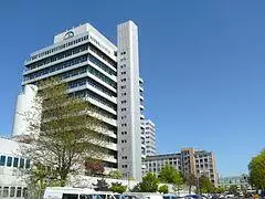A further expansion in Elberfeld was impossible, so the company moved to the village Wiesdorf at Rhein and settled in the area of the alizarin producer Leverkus and Sons. A new city, Leverkusen, was founded there in 1930 and became home to Bayer AG's headquarters. The company's corporate logo, the Bayer cross, was introduced in 1904, consisting of the word BAYER written vertically and horizontally, sharing the Y and enclosed in a circle.[11] An illuminated version of the logo is a landmark in Leverkusen.[12]
