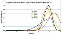 A computer simulation of the changing belief as 50 fragments are unearthed is shown on the graph. In the simulation, the site was inhabited around 1420, or . By calculating the area under the relevant portion of the graph for 50 trials, the archaeologist can say that there is practically no chance the site was inhabited in the 11th and 12th centuries, about 1% chance that it was inhabited during the 13th century, 63% chance during the 14th century and 36% during the 15th century. The Bernstein-von Mises theorem asserts here the asymptotic convergence to the "true" distribution because the probability space corresponding to the discrete set of events is finite (see above section on asymptotic behaviour of the posterior).