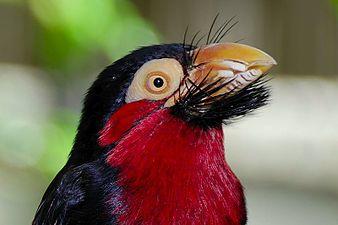 The bearded barbet (Lybius dubius) is an African barbet. Barbets are near passerine birds with a worldwide tropical distribution, although New World and Old World barbets are placed in different families. The barbets get their name from the bristles which fringe their heavy bills.