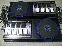 Konami also released home versions of IIDX for the PlayStation 2 console in Japan.[14] The home versions are known as CS (consumer software or console) styles, while the arcade versions are known as AC (arcade cabinet or arcade) styles. The CS games can be played with a DualShock controller or with a special controller from Konami that recreates the arcade experience. Konami manufactures two forms of home controllers, which are known as Konami Official Controllers (KOC) and Arcade Style Controllers (ASC). The KOC, pictured above, is much cheaper than the ASC, but is smaller than the ASC. In addition, KOCs look very different from ASCs and have a smaller space between the turntable and the keys. Konami purports the ASCs to be "arcade-accurate," in that they both resemble and feel like a controller on an arcade machine. For example, the controller itself is much larger and has the turntable further away from the keys. Both styles have a detachable key panel that can be placed to the left or the right of the turntable as the player desires. Aftermarket controllers are also readily available, often containing lit turntables and keys, as well as including microswitch based keys which are meant to closely mimic or be exactly like the ones used in the arcade.