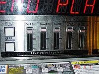 The beatmania IIDX cabinet has many standard features that are found in traditional arcade cabinets such as a widescreen display, powerful speakers, and start buttons. Also, unique to IIDX cabinets are the effector buttons and sliders, a bass platform transducer, marquee, and DJ simulating controller. The effector buttons and sliders allow the player to control the volume levels within the game and manipulate the music by adding additional sound effects. The bass platform vibrates beneath the player's feet to the beat of the music being played. The marquee is a series of sixteen-segment display LEDs, used to display game information and scores during gameplay.[12]
