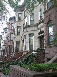 Construction of masonry row houses in the 1870s began to transform the rural district into an urban area. The first row of masonry houses in Stuyvesant Heights was built in 1872 on MacDonough Street for developer Curtis L. North. In the 1880s and 1890s, more rows were added, most of the Stuyvesant Heights north of Decatur Street looked much as it does today. Stuyvesant Heights was emerging as a neighborhood entity with its own distinctive characteristics. The houses had large rooms, high ceilings and large windows, and were built primarily by German immigrants.[13] The people who bought these houses were generally upper-middle-class families, mostly lawyers, shopkeepers, and merchants of German and Irish descent, with a sprinkling of English people; there were also a few professionals. A contemporary description calls it a very well kept residential neighborhood, typical of the general description of Brooklyn as "a town of homes and churches."