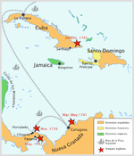 In August 1790, the 16th Foot sailed to Nova Scotia, moving in the following year to Jamaica.[5] In 1793 the French plantation-owners of the colony of Saint-Domingue signed an agreement to place the territory under British sovereignty in return for assistance in halting a slave rebellion. Soldiers of the 16th Foot formed part of the British detachment, but they were all but wiped out by disease: only one officer and one sergeant of the 16th returned alive to Jamaica in 1794.The 16th Foot, as part of the garrison of Jamaica, fought in the Second Maroon War in 1795–96, before returning to England late in 1796.[5] The much-depleted regiment attempted to recruit in Scotland, before being brought up to strength by volunteers from English militia regiments in 1798. In 1799–1804, the 16th Foot was stationed in England, Scotland and Ireland.[5]