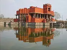 The Khandoba temple is situated on the eastern hills. Built in Hemadpanti style. Two symmetrical, octagonal dīpmal (tower of light) rising 21.33 meters (70 ft) are standing in front of the temple. Towers have carved figures of humans and animals, now most of them defaced. There are two stories about the construction of this temple. One says that it was built by Sultanji Nimbalkar a Jagirdar of Nizam era. The other says that it was built by Mahadji Scindia. Tārīkh-e-Bīr (History of Beed) mentions it with Nimbalkar.[5]