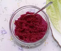 Beetroot can be boiled or steamed, peeled, and then eaten warm with or without butter as a delicacy; cooked, pickled, and then eaten cold as a condiment; or peeled, shredded raw, and then eaten as a salad. Pickled beets are a traditional food in many countries.