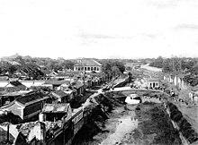 The Legation Quarter was rectangular in shape, approximately 1,300 metres (4,300 ft) east to west and 700 metres (2,300 ft) north to south. The southern boundary was the city wall of Beijing, commonly called the Tartar Wall. The Tartar wall was massive, 13 metres (43 ft) high and 13 metres (43 ft) thick on top. The northern boundary was near the wall around the Imperial City. On the east the Legation Quarter was bordered near the Hata gate, the Chongwenmen in pinyin, and on the west near the Chien or Zhengyang gate, the Qianmen in pinyin.[4] Legation Street, now called Dongjiaomin Xiang (East Foreign Residents Alley), bisected the Legation Quarter from east to west. The Imperial Canal, described as "noxious" ran through the center of the quarter from north to south, exiting the legation quarter through a watergate beneath the Tartar Wall.[5] The quarter had its own postal system and taxes.[6]