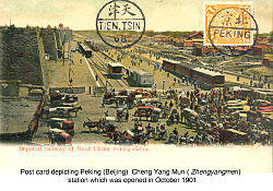 Most of the buildings, Chinese and foreign-owned, in the Legation Quarter were damaged or destroyed during the Boxer Rebellion. The area was quickly rebuilt and became more European. In 1902, legations had been rebuilt and expanded, Legation Street had been paved, and the Peking-Mukden Railway from Tianjin had been extended to the Chien (Zhengyang) gate, just across the Tartar Wall from the Legation Quarter.[12] Foreign soldiers patrolled the streets of the Legation Quarter, and Chinese houses and property had been expropriated or purchased. A wall had been constructed around the Legation Quarter and outside the wall a grassy area, a glacis, gave the soldiers a field of visibility to warn them of advancing trouble—and also isolating them from the Chinese.[13]