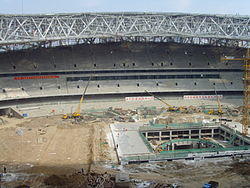 In an attempt to hide steel supports for the retractable roof, required in the bidding process, the team developed the "random-looking additional steel" to blend the supports into the rest of the stadium.[9] Twenty-four trussed columns encase the inner bowl,[11] each one weighing 1,000 tons.[7] Despite the random appearance of the Stadium, each half is nearly symmetrical.[12] After a collapse of a roof at the Charles de Gaulle Airport,[7] Beijing reviewed all major projects. It was decided to eliminate the retractable roof, the original inspiration for the "nest" design,[7] as well as 9,000 seats from the design.[12] The removal of the elements helped to bring the project under the reduced construction budget of $290 million, from an original $500 million.[7] With the removal of the retractable roof, the building was lightened, which helped it stand up to seismic activity; however, the upper section of the roof was altered to protect fans from weather.[12] Enerpac was granted the contract to perform the stage lifting and lowering of the stadium roof as part of the construction process.[13] China National Electric Engineering Co. Ltd. CNEEC and China National Mechanical Engineering Company lifted and welded the steel structure. Due to the stadium's outward appearance, it was nicknamed "The Bird's Nest". The phrase was first used by Herzog & de Meuron, though the pair still believes "there should be many ways of perceiving a building."[9] The use is a compliment Li explained, "In China, a bird's nest is very expensive, something you eat on special occasions."[7]
