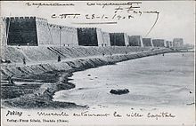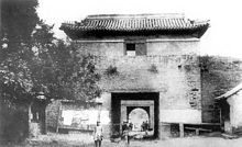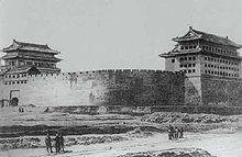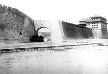 During the Ming and Qing dynasties, the principal defensive weapons were firelocks, cannons, and bows and arrows. In 1629, Houjin troops attacked Beijing, and in 1644, Li Zicheng's troops laid siege to Beijing. Troops atop the city walls used cannons extensively during both sieges.[8] During the Second Opium War (1856–1860), invading troops stationed outside the city walls gave up, because Beijing was too extensively protected. They then went on to burn down Yuanmingyuan and attack Haidian to the northwest. Between 13 August and 15 August 1900, when the Eight-Nation Alliance invaded Beijing, the fortifications withstood bombardment by cannon attacks for two full days before being overrun. The Qing forces took full advantage of their higher elevation and the protection of the thick walls to shoot Alliance troops. Russian and Japanese forces attempted several times to use nitrocellulose to blow a gap in the wall at Dongzhimen and Chaoyangmen, but failed, because every time a soldier tried to light the fuse, he would be shot.[9] The barbicans, enemy sight towers, and corner guard towers proved to be quite effective at deterring enemy attacks. For example, on the night of 13 August, Russian troops succeeded in invading Dongbianmen's watchtower, but suffered heavy casualties in the barbican. It wasn't until the late morning of 14 August that they conquered the gate tower at Dongbianmen, a mere 50 metres (160 ft) away.[10] Even after the Outer City and Inner City fell to Alliance forces, the Imperial city's defenses still held. On the morning of 15 August, American forces used several guns to try to destroy the Tiananmen gates, but they held. Japanese troops used ladders to scale the wall and open the gates, thus allowing Alliance troops into the Imperial city.[10] In an incident on 25 July 1937, a battalion of Japanese troops camped at Fengtai District, declaring that they intended "to protect Japanese immigrants" and "to protect Dongjiaomin Street's Embassy district", tried to advance into Beijing. When they began entering Guang'anmen, around twenty Chinese soldiers fired on them from atop the gate tower, forcing them to abandon their plan. Thus even in the modern era of the 1930s and 1940s, the dilapidated fortifications were still useful defensively.