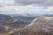 Beinn Eighe is a complex mountain massif in the Torridon area of Wester Ross in the Highlands of Scotland. Lying to the south of Loch Maree, it forms a long ridge with many spurs and summits, two of which are classified as Munros. The name Beinn Eighe comes from the Scottish Gaelic meaning File Mountain.[3] Unlike most other hills in the area it has a cap of Cambrian basal quartzite which gives the peaks of Beinn Eighe a distinctive light colour. Its complex topography has made it popular with both hillwalkers and climbers and the national nature reserve on its northern side makes it an accessible mountain for all visitors.