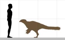 Beipiaosaurus were small-sized therizinosaurs, measuring 2.2 m (7.2 ft) in length, and before the discovery of Yutyrannus they were the largest dinosaurs known from direct evidence to be feathered.[1] They are estimated to have weigh between 45 to 91 kg (99 to 201 lb).[7] More advanced therizinosaurids have four functional toes, but the feet of Beipiaosaurus still have reduced inner toes, showing that the derived therizinosaurid condition may have evolved from a three-toed therizinosauroid ancestor. The head was large relative to other therizinosaurs, with the lower jaw measuring about same length as the femur. The neck appears to be shorter compared to other therizinosaurs.[1][5] In 2003 the pygostyle, consisting of the fused five last vertebrae of the tail, was described in greater detail, suggesting that the original function of the pygostyle was not linked with pennaceous feathers.[4]