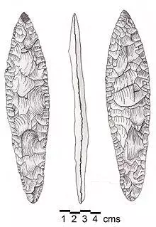 Canaanean Blade. Suggested to be part of a javelin. Fresh grey flint, both sides showing pressure flaking. Somewhat narrower at the base, suggesting a haft. Polished at the extreme point. Found on land of the Lebanese Evangelical School for Girls in the Patriarchate area of Beirut.