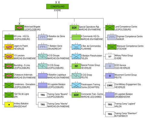 The Land Component is organised as 1 Brigade and 1 Special Operations Regiment. In total, the Land Component consists of almost 10,000 military personnel (as of 2019). After the 2018 reforms, the ground forces are organised as following: