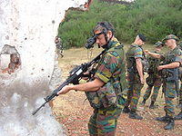 Within the Free Belgian Forces that were formed in Great Britain during the occupation of Belgium between 1940–45, there was a land force formation, the 1st Belgian Infantry Brigade. An additional three divisions were raised and trained in Northern Ireland, but the war ended before they could see action. However, they joined the initial Belgian occupation force in Germany, I Belgian Corps, whose headquarters moved to Luedenscheid in October 1946.[3] Of the 75,000 troops that found themselves in Germany on 8 May 1945, the vast majority had been recruited after the liberation of Belgium.[4]