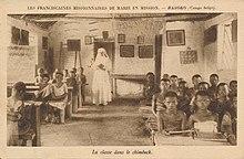 The educational system was dominated by the Roman Catholic Church—as was the case for the rest of Belgium at the time—and, in some rare cases, by Protestant churches. Curricula reflected Christian and Western values. Even in 1948, 99.6% of educational facilities were run by Christian missions. Indigenous schooling was mainly religious and vocational. Children received basic education such as learning how to read, write and some mathematics. The Belgian Congo was one of the few African colonies in which local languages (Kikongo, Lingala, Tshiluba and Swahili) were taught at primary school. Even so, language policies and colonial domination often went hand in hand, as evidenced by the preference given to Lingala—a semi-artificial language spread through its common use in the Force Publique—over more local (but also more ancient) indigenous languages such as Lomongo and others.[66] In 1940 the schooling rates of children between 6 and 14 years old was 12%, reaching 37% in 1954, one of the highest rates in sub-Saharan Africa. Secondary and higher education for the indigenous population were not developed until relatively late in the colonial period. Black children, in small numbers, began to be admitted to European secondary schools from 1950 onward. The first university in the Belgian Congo, the Catholic Jesuit Lovanium University, near Léopoldville, opened its doors to black and white students in 1954. Before the foundation of the Lovanium, the Catholic University of Louvain already operated multiple institutes for higher education in the Belgian Congo. The Fomulac (Fondation médicale de l'université de Louvain au Congo), was founded in 1926, with the goal of forming Congolese medical personnel and researchers specialized in tropical medicine. In 1932 the Catholic University of Louvain founded the Cadulac (Centres agronomiques de l'université de Louvain au Congo) in Kisantu. Cadulac was specialized in agricultural sciences and formed the basis for what was later to become Lovanium University.[67] In 1956 a state university was founded in Elisabethville. Progress was slow though; until the end of the 1950s, no Congolese had been promoted beyond the rank of non-commissioned officer in the Force Publique, nor to a responsible position in the administration (such as head of bureau or territorial administrator).