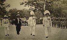 The paternalistic ideology underpinning colonial policy was summed up in a catch-phrase used by Governor-General Pierre Ryckmans (1934–46): Dominer pour servir ("Dominate to serve").[71] The colonial government wanted to convey images of a benevolent and conflict-free administration and of the Belgian Congo as a true model colony. Only in the 1950s did this paternalistic attitude begin to change. In the 1950s the most blatant discriminatory measures directed at the Congolese were gradually withdrawn (among these: corporal punishment by means of the feared chicote—Portuguese word for whip). From 1953, and even more so after the triumphant visit of King Baudouin to the colony in 1955, Governor-General Léon Pétillon (1952–1958) worked to create a "Belgian-Congolese community", in which blacks and whites were to be treated as equals.[72] Regardless, anti-miscegenation laws remained in place, and between 1959 and 1962 thousands of mixed-race Congolese children were forcibly deported from the Congo by the Belgian government and the Catholic Church and taken to Belgium.[73]