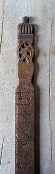 A primstav is the ancient Norwegian calendar stick. These were engraved with images instead of runes. The images depicted the different nonmoving religious holidays. The oldest primstav still in existence is from 1457 and is exhibited at Norsk Folkemuseum.