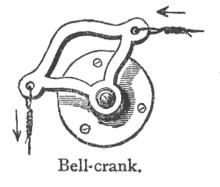 A bellcrank is a type of crank that changes motion through an angle. The angle can be any angle from 0 to 360 degrees, but 90 degrees and 180 degrees are most common. The name comes from its first use, changing the vertical pull on a rope to a horizontal pull on the striker of a bell, used for calling staff in large houses or commercial establishments.