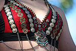 Tribal belly dance costumes draw inspiration from traditional folkloric costumes across the globe and include circle skirts, pantaloons, and turbans or headdresses decked with feathers or flowers.[34]