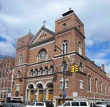 Among the neighborhood's array of Italian restaurants and markets, there are multiple landmarks. Our Lady of Mount Carmel, a Roman Catholic church on E. 187th Street at the corner of Belmont Avenue, was constructed in 1906.[25] The Arthur Avenue Retail Market, which extends the block between Arthur Avenue and Belmont Avenue, features an array of Italian meats, cheeses, and other goods, as well as cigars, a bar, and a dining area.