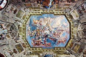 The construction of the Upper Belvedere began as early as 1717, as testified by two letters that Prince Eugene sent from Belgrade to his servant Benedetti in summer 1718, describing the progress of work on the palace. Construction was so far advanced by 2 October 1719 that the prince was able to receive the Turkish ambassador Ibrahim Pasha there. The decoration of the interior started as early as 1718. In 1719 he commissioned the Italian painter Francesco Solimena to execute both the altarpiece for the Palace Chapel and the ceiling fresco in the Golden Room. In the same year Gaetano Fanti was commissioned to execute the illusionistic quadratura painting in the Marble Hall. In 1720 Carlo Carlone was entrusted with the task of painting the ceiling fresco in the Marble Hall, which he executed from 1721 to 1723.