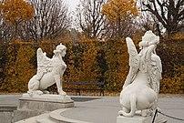 The garden had a scenery enclosed by clipped hedging, even as the Belvedere was building, in the formal French manner with gravelled walks and jeux d'eau by Dominique Girard, who had trained in the gardens of Versailles as a pupil of André Le Nôtre. Its great water basin in the upper parterre and the stairs and cascades peopled by nymphs and goddesses that links upper and lower parterres survive, but the patterned bedding has long been grassed over; it is currently being restored.