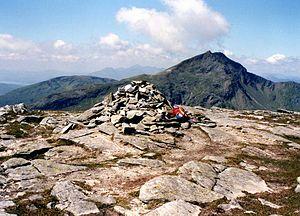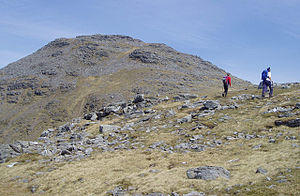 Because of a lack of good access paths from the south (Glen Falloch), Ben Oss is usually climbed from the area just south of Tyndrum, with the usual start being at Dalrigh (grid reference NN343292) on the A82 road. Many guide books recommend climbing Ben Oss with Beinn Dubhchraig from Dalrigh and this allows for a less steep approach over Dubhchraig and then continuing to Ben Oss via the Bealach Buidhe. A circular walk around the head of the Cononish glen can be continued over Ben Lui and Beinn Chuirn to finish again at Dalrigh.[4] The summit of the mountain is flattish and the medium size cairn stands on an area of large slabby rocks interspersed with grass. The summit has a prominence of 342 metres and gives a fine vista of the southern highlands, it is a good place to admire the craggy eastern face of neighbouring Ben Lui.