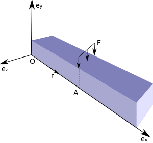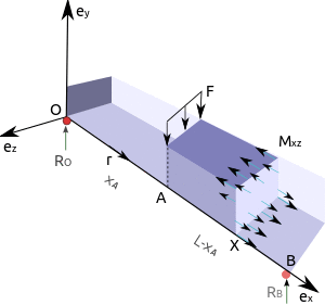 In the beam shown in the adjacent figure, the external forces are the applied force at point A () and the reactions at the two support points O and B ( and ). For this situation, the only non-zero component of the bending moment is