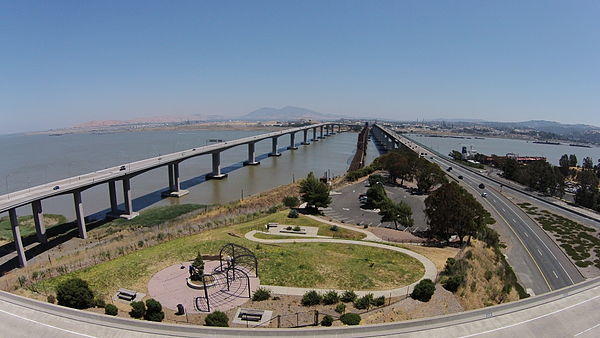 The original 1.2-mile (1.9 km) deck truss bridge opened in 1962 to replace the last automotive ferry service in the San Francisco Bay Area. The 1962 bridge has seven 528-foot (161 m) spans and 138 feet (42 m) of vertical clearance, now carrying four lanes of southbound traffic, as well as a path for pedestrians and bicyclists.[1] It was named the George Miller Jr., Memorial Bridge in 1975 after California state legislator George Miller Jr.[2] A 1.7-mile (2.7 km) bridge was built alongside and opened on August 25, 2007 with five lanes of northbound traffic. In 2007, it was named the Congressman George Miller Benicia–Martinez Bridge after U.S. Congressman George Miller, Miller Jr.'s son.[2] The cost of the 1962 span was US$25 million and US$1.3 billion for the 2007 span.[3] (Adjusted for inflation, equivalent to $211 million and $1.6 billion respectively.) The bridge is part of Interstate 680, a major transportation link connecting other heavily traveled freeways.