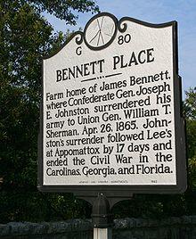 Bennett Place, Durham, North Carolina, was the site of the last surrender of a major Confederate army in the American Civil War, when Joseph E. Johnston surrendered to William T. Sherman. The first meeting (April 17, 1865) saw Sherman agreeing to certain political demands by the Confederates, which were promptly rejected by the Union cabinet in Washington. Another meeting had to be held (April 26) to agree on military terms only, in line with Robert E. Lee’s recent surrender to Ulysses S. Grant. This effectively ended the war.