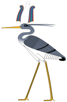 New Kingdom artwork shows Bennu as a huge grey heron with a long beak and a two-feathered crest. Sometimes Bennu is depicted as perched on a benben stone (representing Ra and the name of the top stone of a pyramid) or in a willow tree (representing Osiris). Because of the connection with Osiris, Bennu sometimes wears the Atef crown,[3] instead of the solar disk.